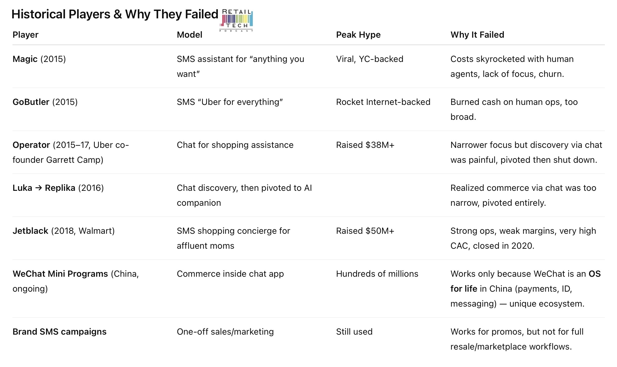 Jetblack (2018–2020): Walmart’s bet on SMS shopping targeted affluent mothers. With dedicated human concierges, Jetblack offered premium service but at enormous cost. Despite raising $50M, retention was weak, CAC was high, and margins unsustainable.